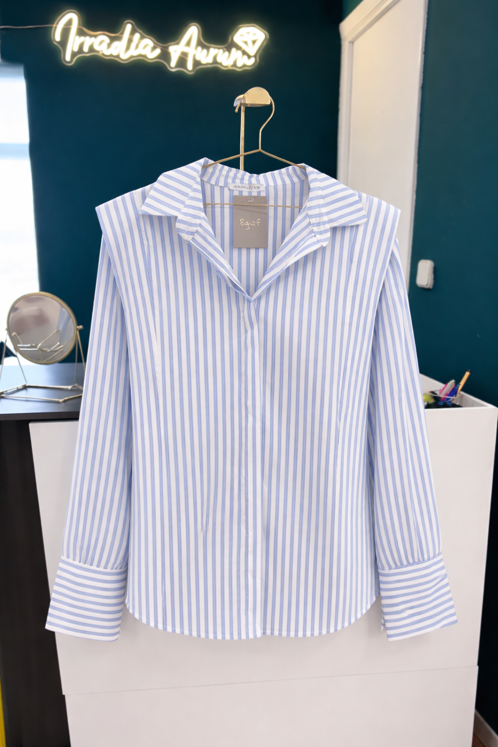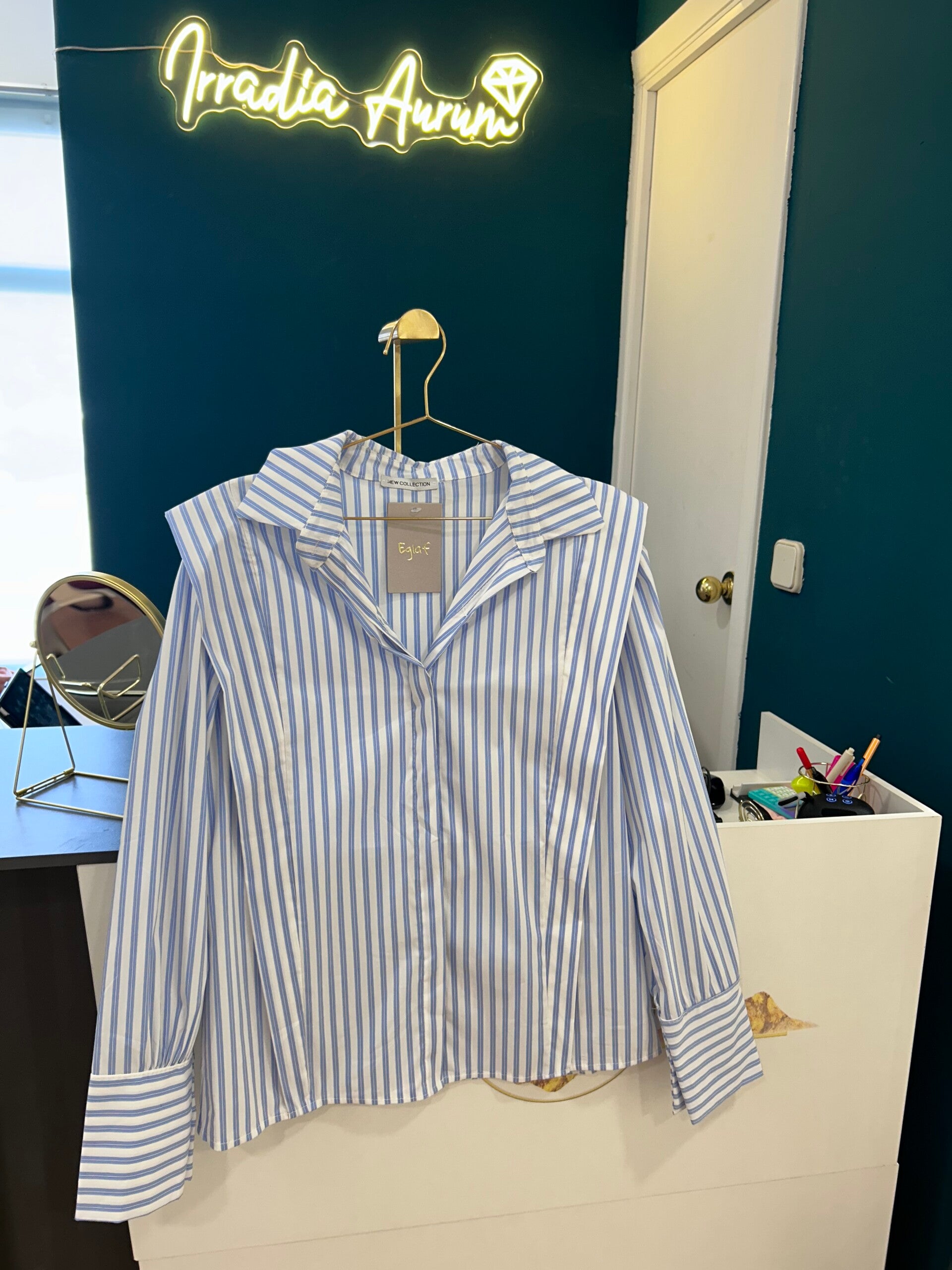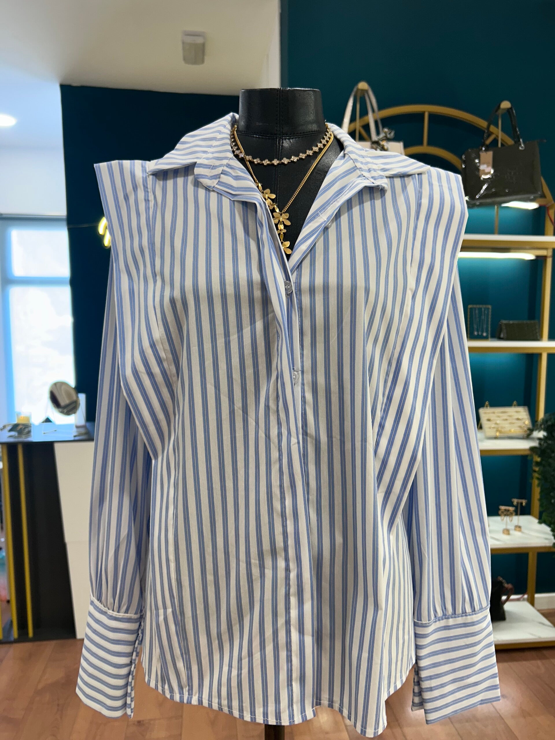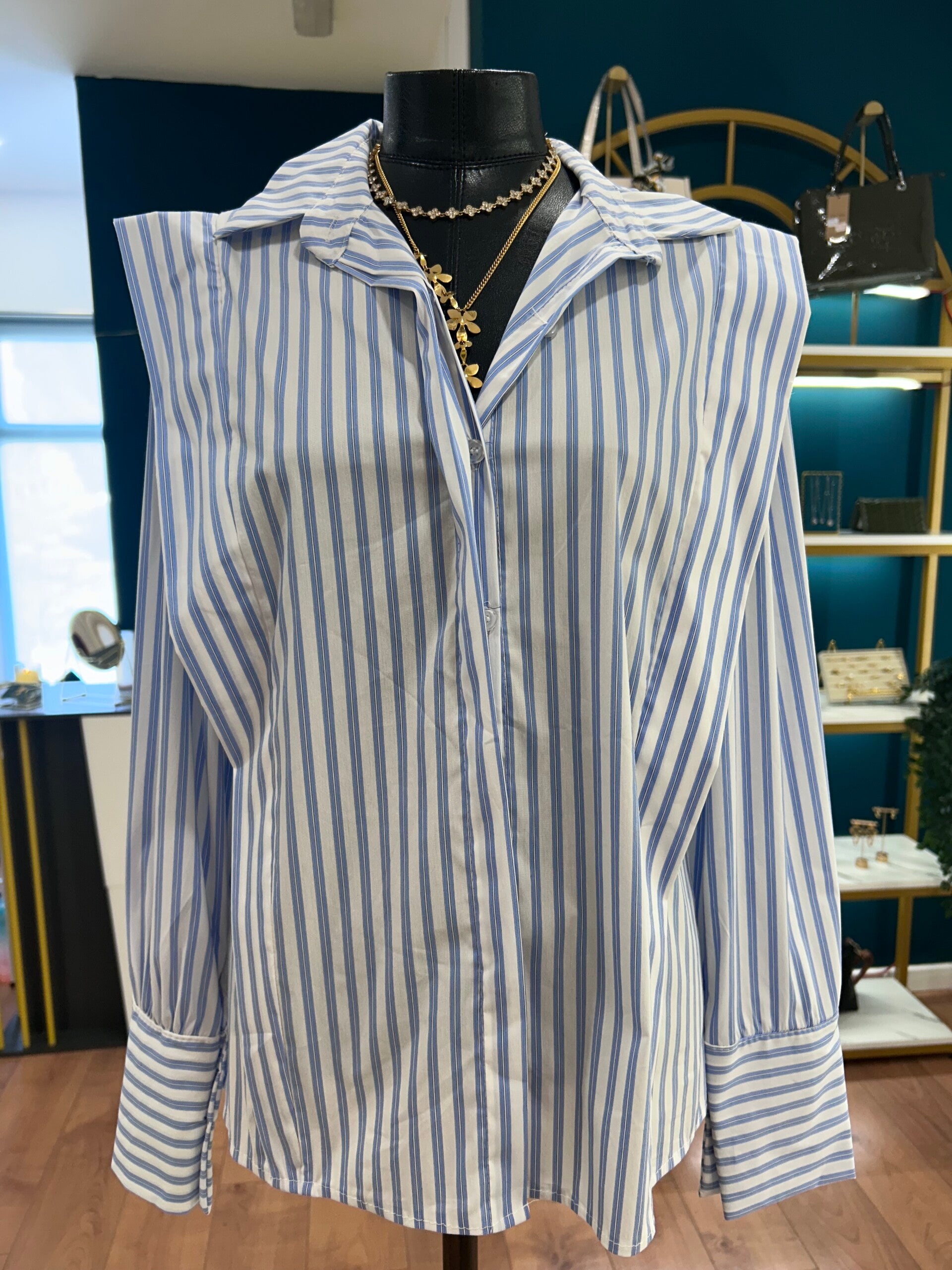 Camisa de corte estructurado confeccionada en algodón de tacto suave, con diseño de rayas verticales en azul cielo y blanco que estilizan la silueta. Destaca por sus hombreras marcadas, que aportan un aire sofisticado y moderno, y por su cuello camisero clásico con escote en pico sutil.