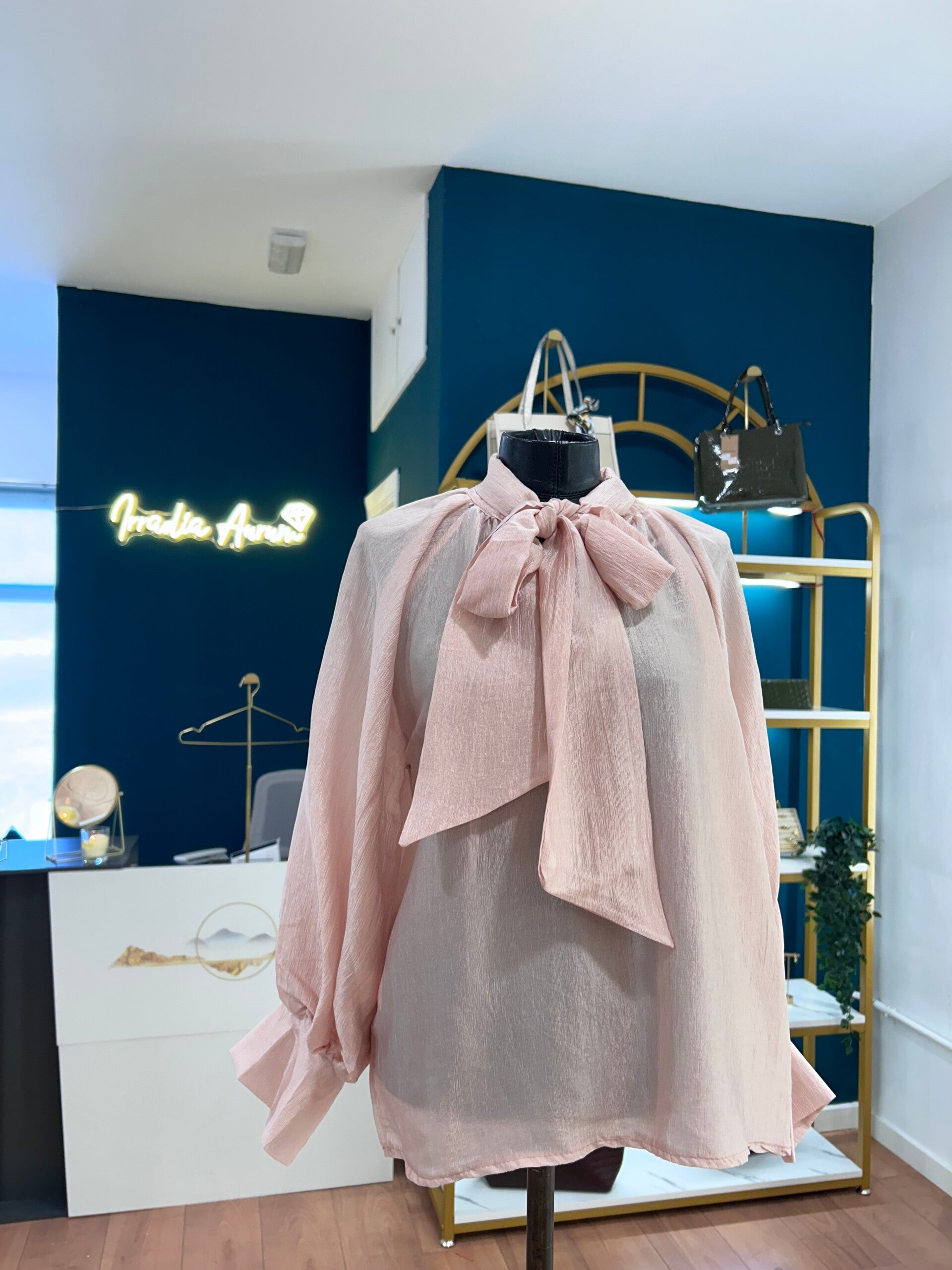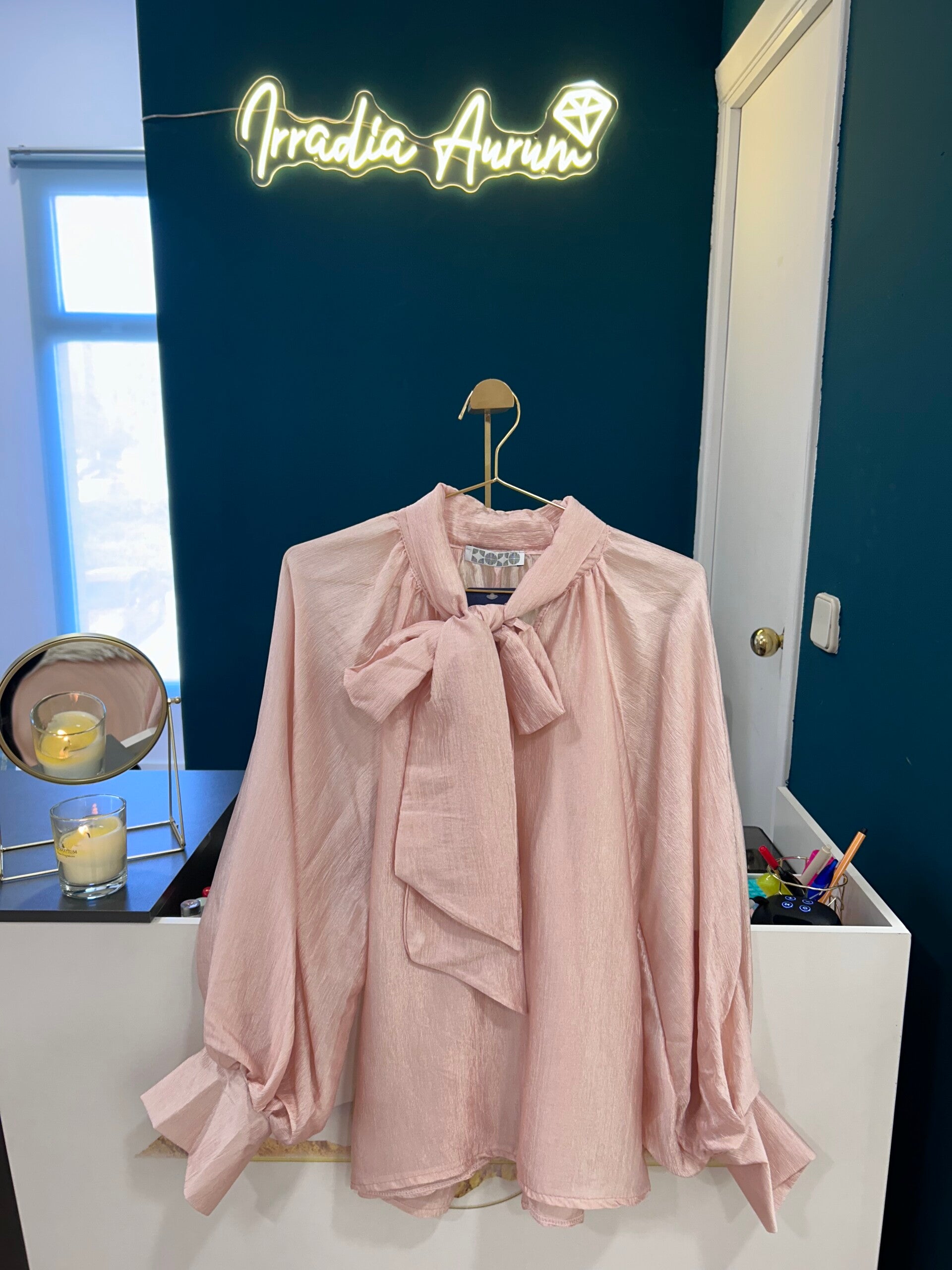 Blusa de tejido ligero con acabado satinado en tono rosa empolvado, diseñada para aportar elegancia, delicadeza y un toque muy femenino a cualquier look. Su protagonista es la gran lazada al cuello, que realza la prenda con un estilo refinado y sofisticado.
