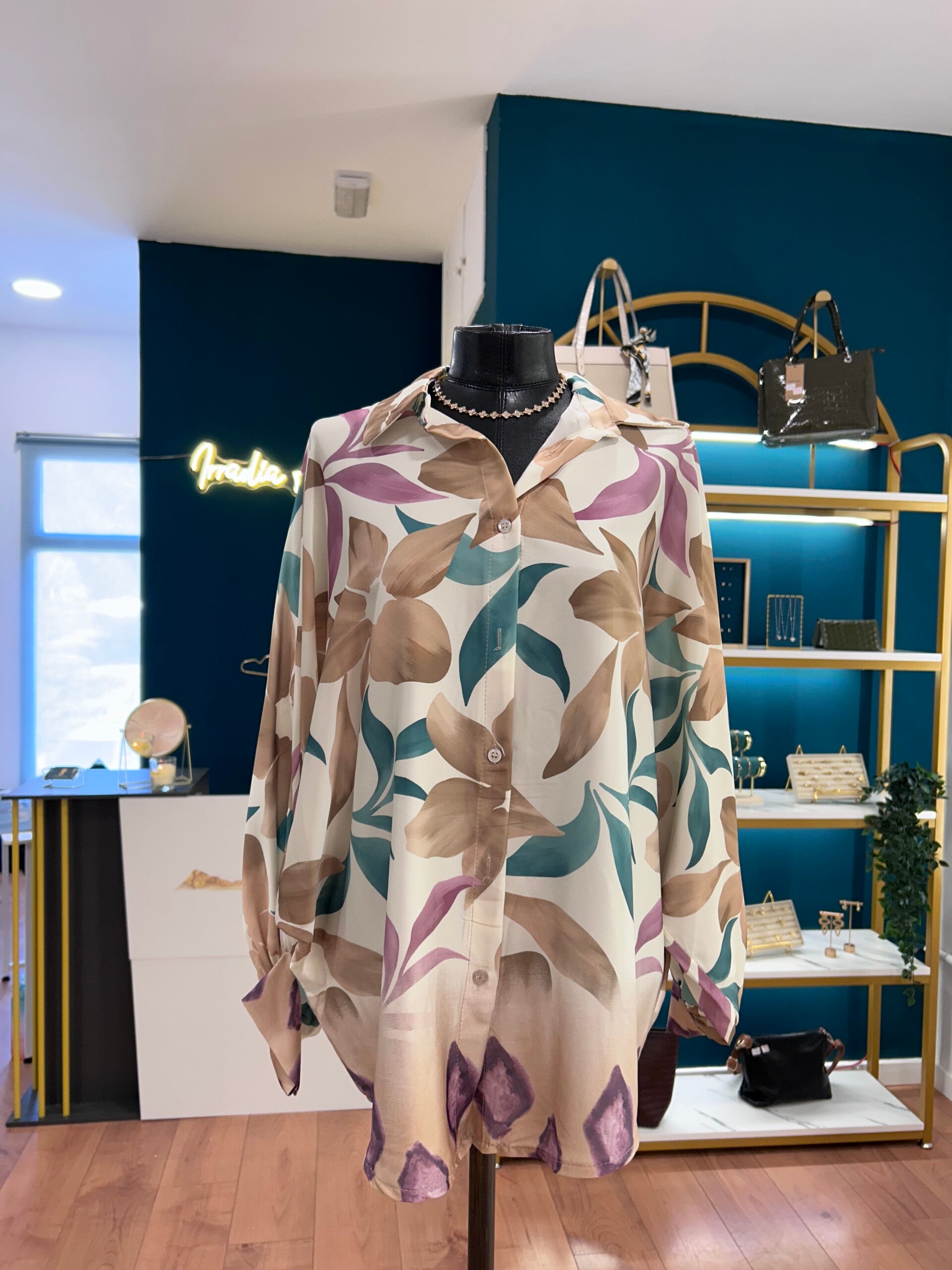 Blusa elegante y ligera con un hermoso estampado floral en tonos beige, crema, verde petróleo y lila, perfecta para lograr un look femenino, sofisticado y fácil de combinar.