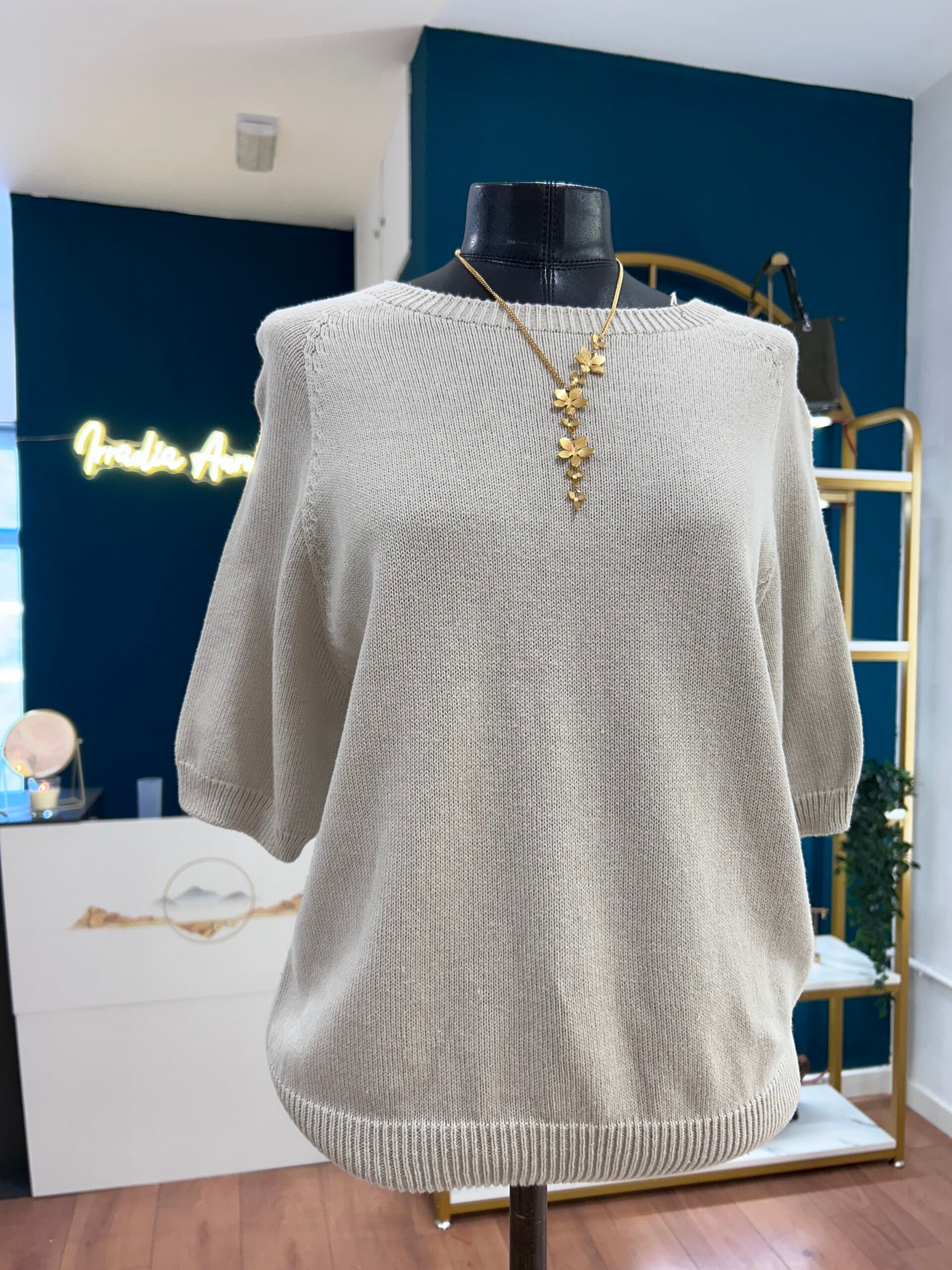 Suéter femenino y versátil en un elegante tono beige claro / arena, ideal para crear looks cómodos, frescos y sofisticados. Su diseño de tejido ligero, cuello redondo y manga amplia a media altura lo convierte en una prenda perfecta para lucir arreglada sin esfuerzo.