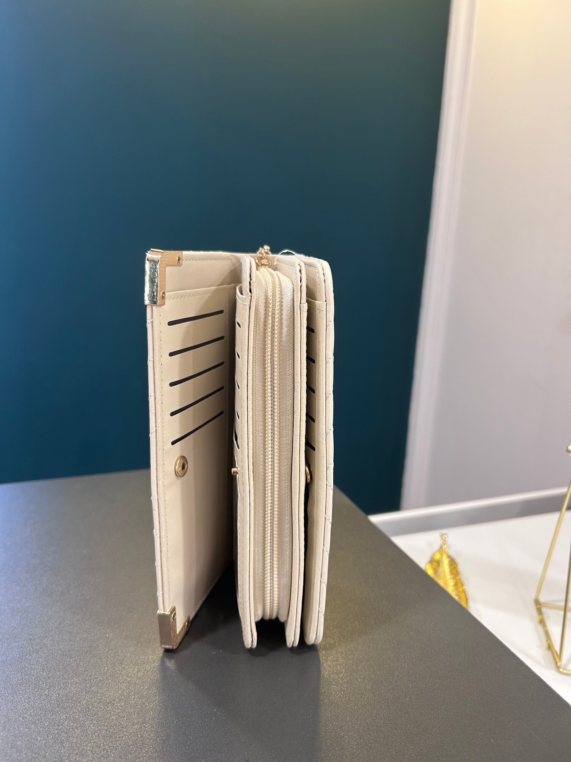 Esta cartera en tono blanco destaca por su delicado diseño tejido en la parte frontal, un detalle que aporta profundidad y sofisticación a una pieza minimalista. Su acabado en efecto cuero realza su elegancia, creando el equilibrio perfecto entre lo clásico y lo contemporáneo.