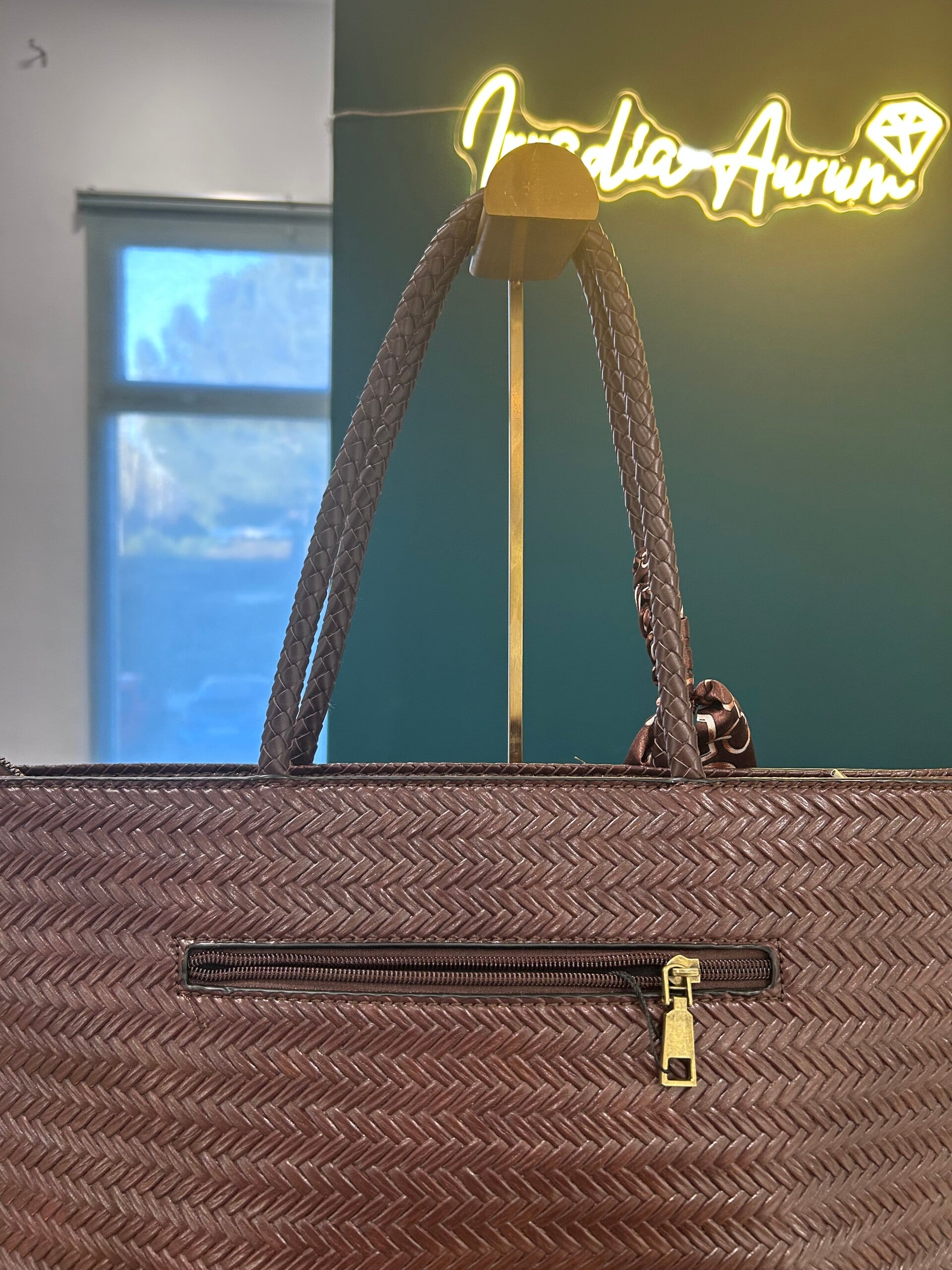 Este bolso en tono marrón se distingue por su diseño entrelazado, que aporta profundidad, artesanía y un estilo único. La cinta decorativa añade un toque dinámico y femenino, elevando la pieza con un aire moderno y sofisticado.