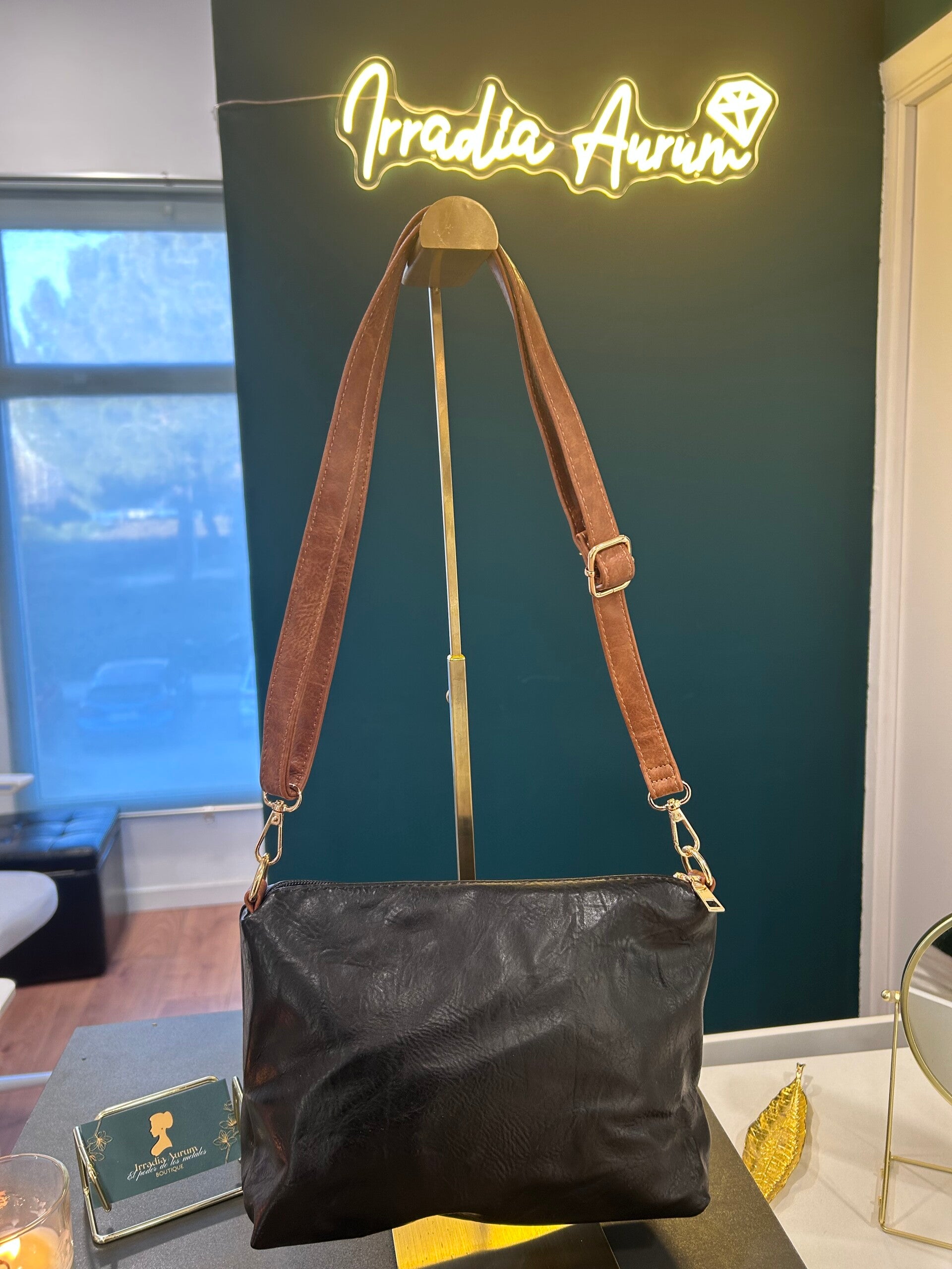 Este bolso negro de diseño minimalista se combina con una correa en tono café que aporta contraste y calidez, creando un look casual con un toque sofisticado. Su acabado tipo cuero realza su carácter atemporal, convirtiéndolo en un básico imprescindible.